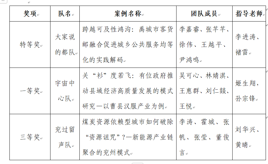 备赛期间,指导教师团队与参赛队员紧密协作、攻坚克难,以专业态度打磨案例与答辩内容,用实干诠释奋斗精神;学校长期将MPA案例教学作为研究生培养重点,通过搭建培育平台、提供资源支持,为参赛队伍筑牢冲刺基础。其中,李进涛、褚雷老师指导的“大家说得都队”(队员:李嘉睿、张芊芊、徐伟、王越平、尹鸿鸣)斩获特等奖;姬生翔、孙宗锋老师共同指导的“宇宙中心队”(队员:吴可心、林婧淇、王惠群、刘仁燚、王悦)斩获一等奖;刘华兴、黄晴老师共同指导的“兖过留声队”(队员:李涛、霍城、张帆、张莹、董俊言)获得三等奖。其中,孙宗锋、姬生翔、李进涛、褚雷老师获“最佳指导教师”奖,张芊芊、林婧淇同学获“最有价值队员”奖。
