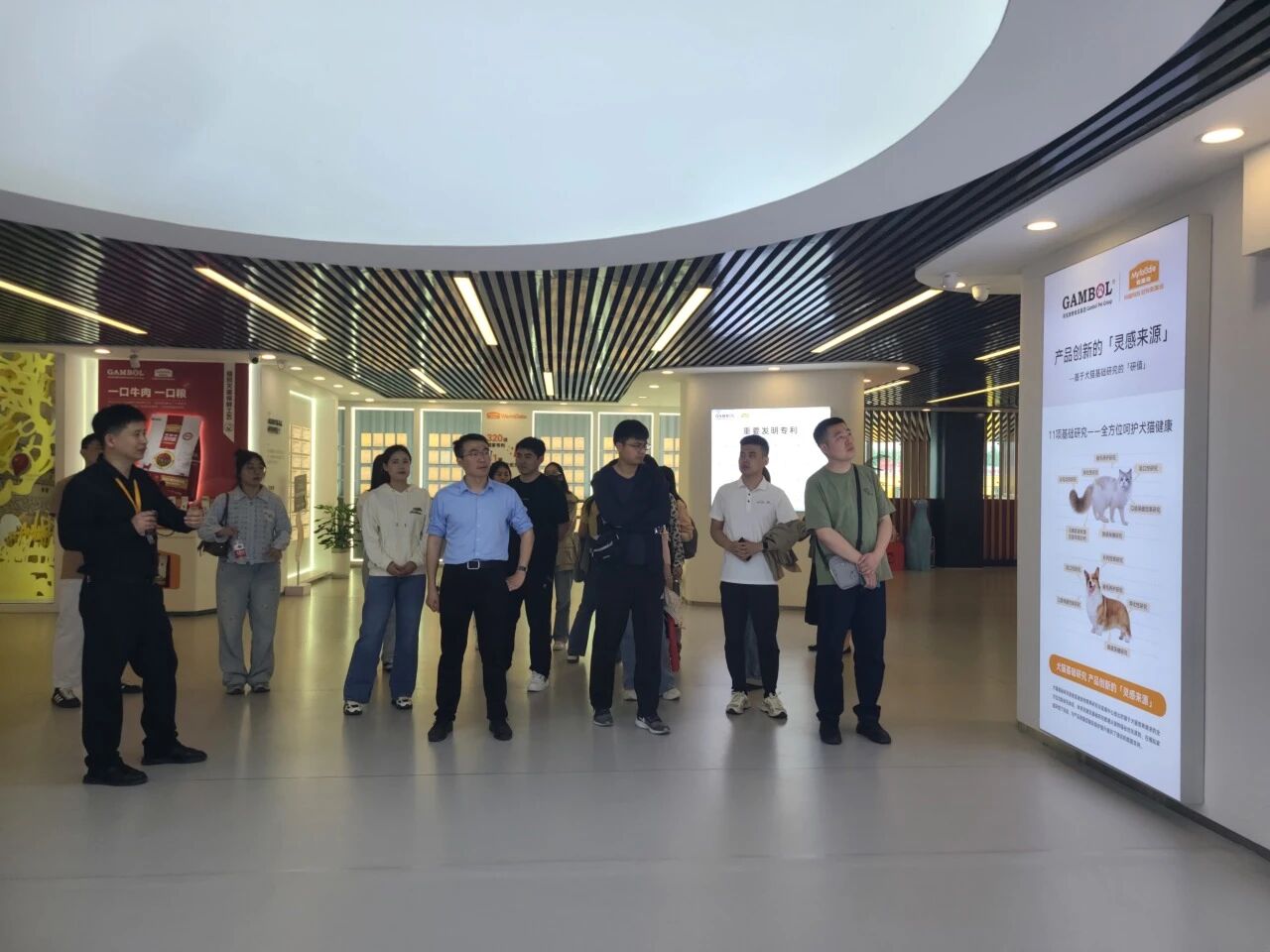 下午的产业调研环节,师生们走进乖宝集团,对智能化生产链等项目设施开展了实地调研。在智慧车间,同学们参观了工厂的全自动生产线与AI质检系统。负责人介绍了2025年发布的麦富迪WarmData犬猫天性研究大数据中心,该中心通过融合基因图谱、行为模态与环境交互数据,推动宠物食品研发从经验主义迈向数据时代。负责人表示,“数字化转型不仅是技术升级,更是组织变革。我们通过飞书实现19类业务流程线上化,提升审批效率,真正做到‘让数据跑路,而非人员跑腿’。”